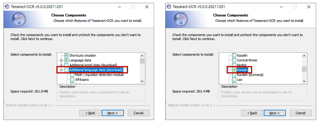 Choose Components 화면에서 Additional language data (download)를 선택하고 Korean 선택