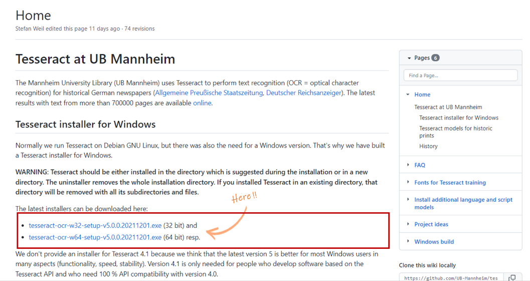 Windows용은 https://github.com/UB-Mannheim/tesseract/wiki 에서 다운로드 가능.